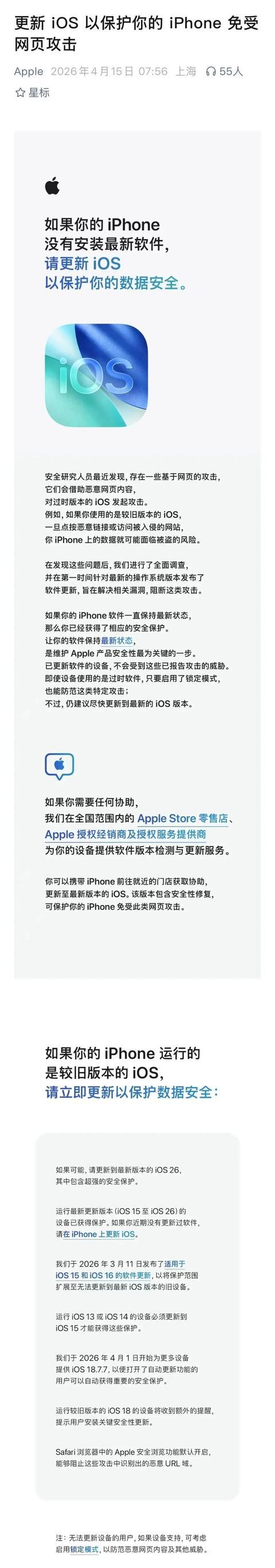 4月15日,苹果官方微信公众号发文表示,安全研究人员最近发现,存在一些基于网页的攻击,它们会借助恶意网页内容,对过时版本的iOS发起攻击。